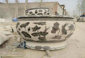 夢幻中式庭院青石浮雕荷花養魚水缸