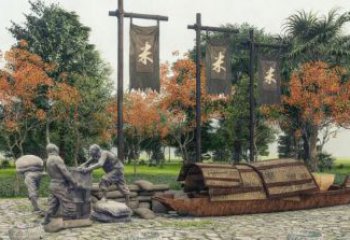 這是一組銅雕景觀小品,呈現(xiàn)傳統(tǒng)商貿(mào)場(chǎng)景:長(zhǎng)辮商人與兩位婦人交易布匹,孩童在旁張望,展現(xiàn)舊時(shí)市井生活的煙火氣與溫情。